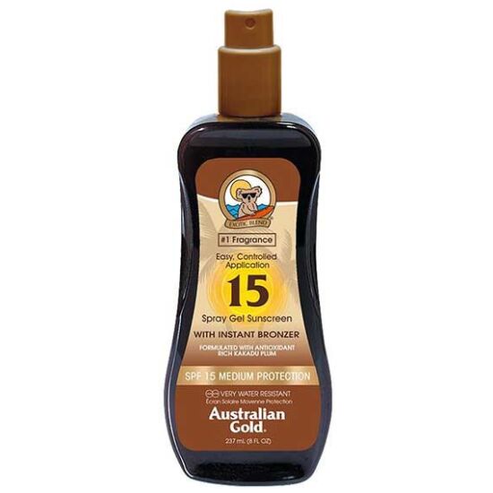 Το Australian Gold SPF 15 Spray Gel with Bronzer 237ml με το Instant Bronzer προσφέρει κορυφαία προστασία από τον ήλιο και εξαιρετική περιποίηση δέρματος. Η πλούσια σε αντιοξειδωτικά φόρμουλα που περιέχει Aloe Vera, Vitamin E, Australian Tea Tree Oil και Sunflower Seed Extracts θρέφει το δέρμα σας ενώ βρίσκεστε στον ήλιο, διατηρώντας το ενυδατωμένο και υγιές. Απορροφά γρήγορα, χωρίς λιπαρή αίσθηση και προσφέρει στο δέρμα σας άμεση λάμψη, ενώ ξεπλένεται εύκολα με νερό, χωρίς να λεκιάζει το δέρμα. Ανθεκτικό στο νερό για έως και 80 λεπτά καθώς και εύκολο στη χρήση, είναι ιδανικό για όσους αναζητούν ένα εύκολο στην εφαρμογή αντηλιακό.
