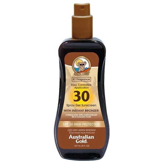 Το Australian Gold SPF 30 Spray Gel with Bronzer 237ml με το Instant Bronzer προσφέρει κορυφαία προστασία από τον ήλιο και εξαιρετική περιποίηση δέρματος. Η πλούσια σε αντιοξειδωτικά φόρμουλα που περιέχει Aloe Vera, Vitamin E, Australian Tea Tree Oil και Sunflower Seed Extracts θρέφει το δέρμα σας ενώ βρίσκεστε στον ήλιο, διατηρώντας το ενυδατωμένο και υγιές. Απορροφά γρήγορα, χωρίς λιπαρή αίσθηση και προσφέρει στο δέρμα σας άμεση λάμψη, ενώ ξεπλένεται εύκολα με νερό, χωρίς να λεκιάζει το δέρμα. Ανθεκτικό στο νερό για έως και 80 λεπτά καθώς και εύκολο στη χρήση, είναι ιδανικό για όσους αναζητούν ένα εύκολο στην εφαρμογή αντηλιακό.