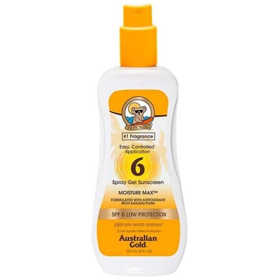 Το Australian Gold SPF 6 Spray Gel 237ml προσφέρει κορυφαία προστασία από τον ήλιο και εξαιρετική περιποίηση δέρματος. Η πλούσια σε αντιοξειδωτικά φόρμουλα που περιέχει Aloe Vera, Vitamin E, Australian Tea Tree Oil και Sunflower Seed Extracts θρέφει το δέρμα σας ενώ βρίσκεστε στον ήλιο, διατηρώντας το ενυδατωμένο και υγιές. Απορροφά γρήγορα, χωρίς λιπαρή αίσθηση και προσφέρει στο δέρμα σας άμεση λάμψη, ενώ ξεπλένεται εύκολα με νερό, χωρίς να λεκιάζει το δέρμα. Ανθεκτικό στο νερό για έως και 80 λεπτά και με ένα εύκολο στη χρήση, είναι ιδανικό για όσους αναζητούν ένα εύκολο στην εφαρμογή αντηλιακό.