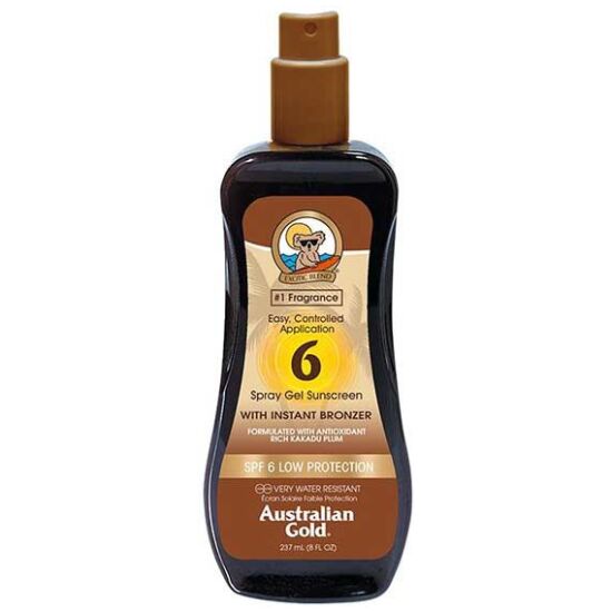 Το Australian Gold SPF 6 Spray Gel with Bronzer 237ml με το Instant Bronzer προσφέρει κορυφαία προστασία από τον ήλιο και εξαιρετική περιποίηση δέρματος. Η πλούσια σε αντιοξειδωτικά φόρμουλα που περιέχει Aloe Vera, Vitamin E, Australian Tea Tree Oil και Sunflower Seed Extracts θρέφει το δέρμα σας ενώ βρίσκεστε στον ήλιο, διατηρώντας το ενυδατωμένο και υγιές. Απορροφά γρήγορα, χωρίς λιπαρή αίσθηση και προσφέρει στο δέρμα σας άμεση λάμψη, ενώ ξεπλένεται εύκολα με νερό, χωρίς να λεκιάζει το δέρμα. Ανθεκτικό στο νερό για έως και 80 λεπτά καθώς και εύκολο στη χρήση, είναι ιδανικό για όσους αναζητούν ένα εύκολο στην εφαρμογή αντηλιακό.