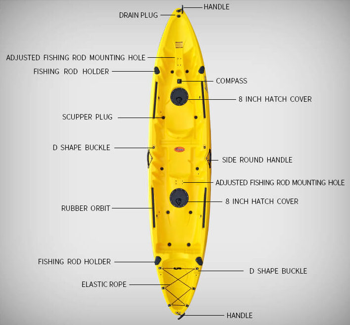 Σχεδιασμός για άνεση και ευκολία στη χρήση. Διαθέτει 2 στεγανές καταπακτές για ασφαλή αποθήκευση προσωπικών αντικειμένων και εξοπλισμού, κρίκους τύπου “D” για σταθερή πρόσδεση αξεσουάρ και εφαρμογή καθίσματος, ελαστικό κορδόνι συγκράτησης για τη μεταφορά αντικειμένων με ασφάλεια και 8 τάπες αποστράγγισης για άμεση απομάκρυνση του νερού και στεγνή επιφάνεια.
