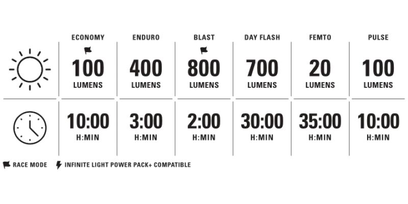 Enduro Mode: 400/03:00 Lumen / hh:mm